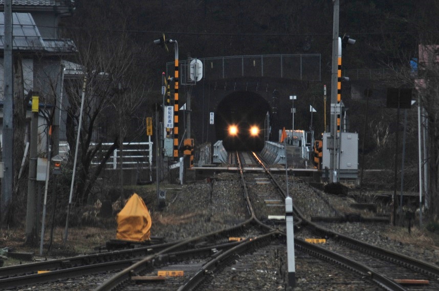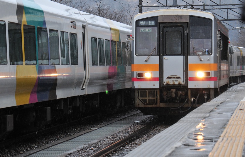 根知で列車交換。目玉を光らせて南小谷行きが接近中。