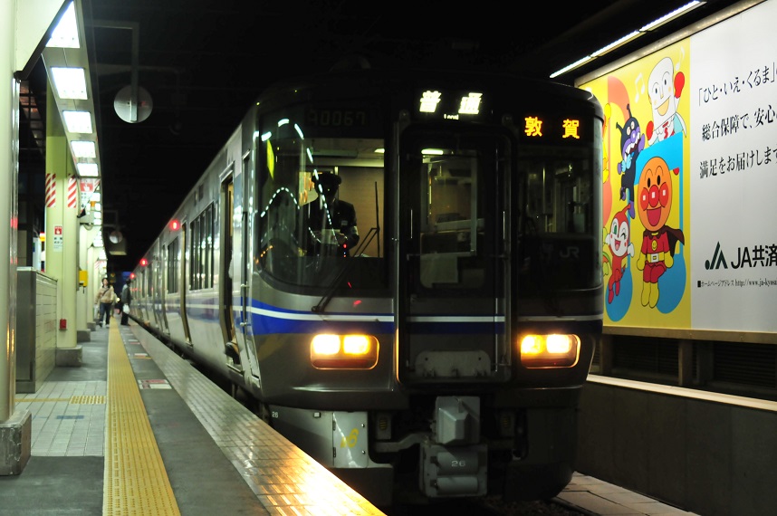 20時10分、敦賀に向けて列車は出発。次の越前花堂で遅れている越美北線の連絡待ち。しばらくすると遅れてやってきた列車から山の格好をしたおばさんが向かってきた。「荒島岳かな??」と勝手に想像する。そして21時01分、終着の敦賀に到着。ここまで来るとだいぶゴールが見えてきた感じだ。
