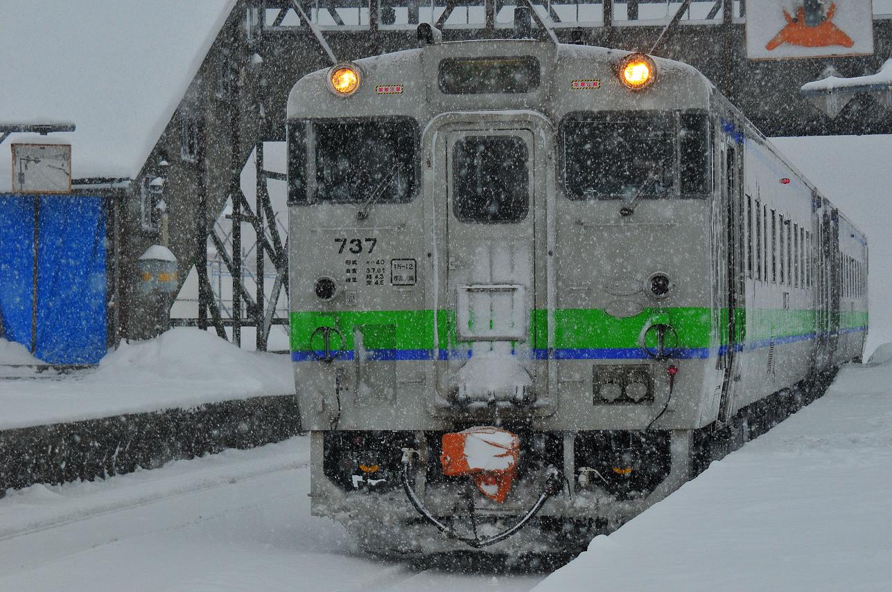 しかし今年は少し違った。なんと今回は男連れだったのだ。「おー成長したじゃねーか!!」 いやーいいねぇ。微笑ましいわ。そして列車は釧路に向け出発。風は強いものの天気は良い。太陽がまぶしい。去年、今年と2年連続での乗車のため今回は精神的にゆとりがある。去年は窓からの景色にかじりついて写真とか撮っていたけど今年は「去年撮ったからもういいや」ってことでうつらうつら居眠り。一駅ごとに目覚めながら富良野へと向かってゆく。富良野まで来ると太陽は姿を隠し雪の量もだいぶ増える。富良野で多くの人が降りそして1両増結。車内はゆったりとしてくる。富良野を出ると雪が横殴りになる。これは落合駅がどうなってるか楽しみだ。そしてその落合に到着。期待通りの大雪だ。去年はここで対向列車を待ったんだけど今年はこちらが待たれる方だった。車外に出て写真を撮ったり雪の降りしきるホームをうろうろしたりして発車までの時間を過ごす。いやー何度来ても好きだわ、冬の落合駅。