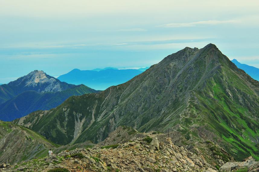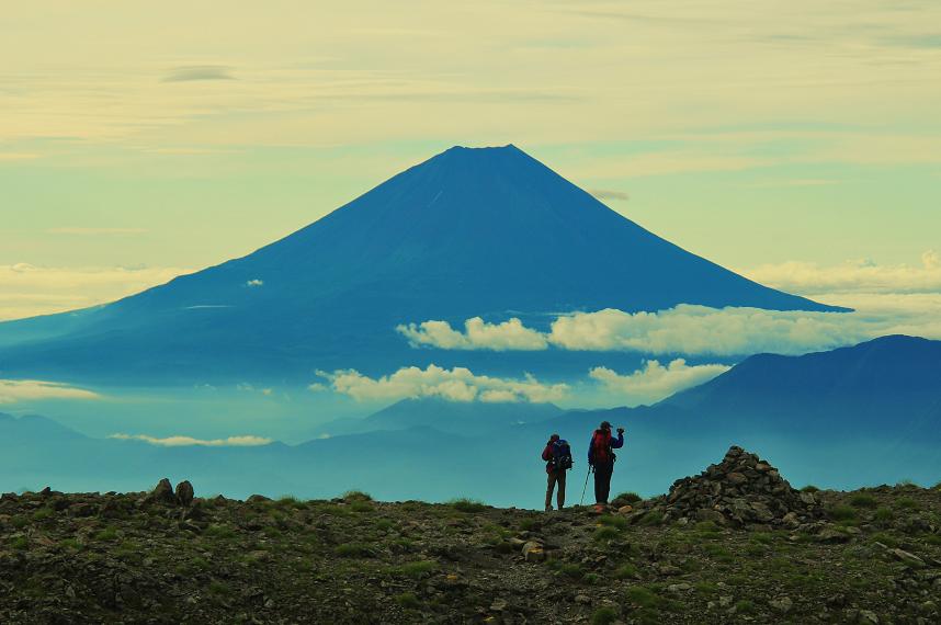 翌日、四時半スタートで間ノ岳を往復。空荷だったんで快調に進みました。途中富士山がきれいに見えました。そして下山。八本歯のコルを目指して下ったのですがこのコース、なかなかハードでした。いやー登りにこのコースを選ばなくてホント良かった。この日も重い荷物にひーひー言いながら歩いたのですが全くペースは上がらず少し歩いては休憩ばかり。結局広河原まで5時間半かかりました。まぁ今回の北岳、完全に完敗でした。とりあえずトレーニング不足に加え装備の軽量化という大きな課題が残りました。