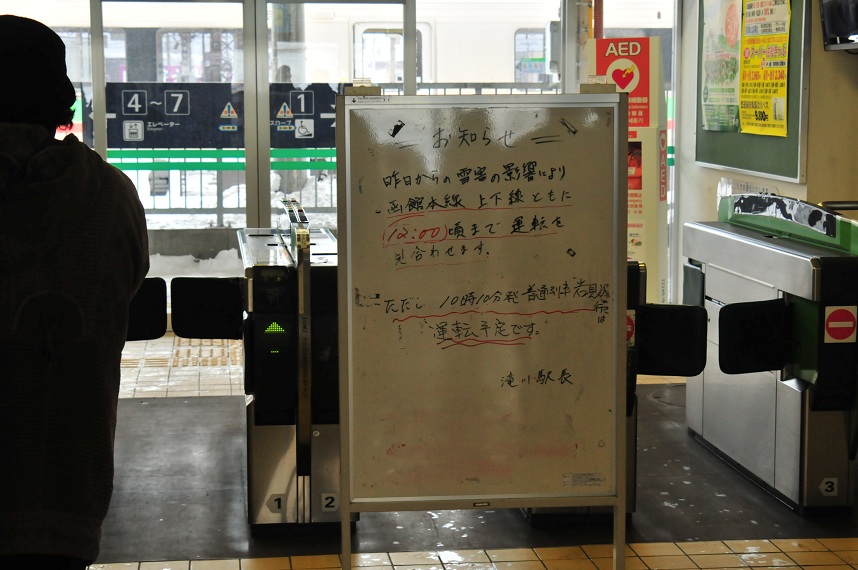 改札の前は運休を知らずにやってくる人たちであふれかえって・・・とまでは言わないけど混雑している。駅員氏やみどりの窓口氏は各種の問い合わせでおおあらわだ。