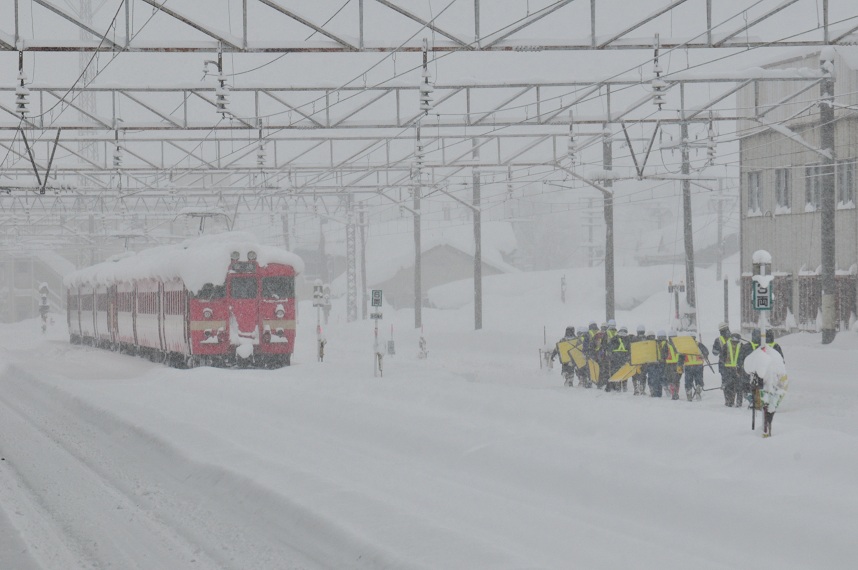 除雪に向かう保線の方々。711系に積もった雪が凄まじい。
