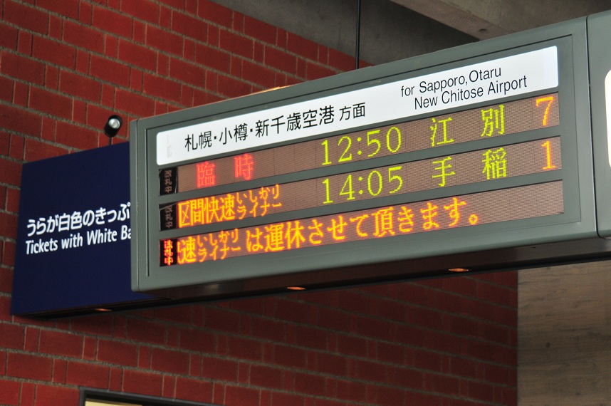 僕はこう考えていた。追分で運行を停めるというのはそこからは列車が連絡しているということ。岩見沢発12時52分発の苫小牧行きの追分着は13時38分。で、苫小牧発13時26分発の岩見沢行きの追分着は14時04分。というわけで追分でバスの乗客と列車の乗客とが入れ替わってそれぞれ岩見沢、苫小牧へと折り返していくのかと思ったら全然そうではないらしい。まぁこれは僕が思い込んでいたことなんだが・・・。そうこうしてるうちに岩見沢発15時06分の苫小牧行きの運休がアナウンスされた。そして13時19分を過ぎてもまだバスは来ない。時刻表を開いて確認するもこの時間から出発して追分までたどり着いたところでそこから先が全くつながらない。苫小牧行きは無いし南千歳に抜けるにも乗車可能の列車は15時30分発のスーパーとかちで南千歳着は15時41分。絶対乗らなきゃならない長万部方面のスーパー北斗16号は南千歳発が15時18分なのである。うわl~ダメだこりゃ。そして激しく後悔する。12時50分発の江別行きに乗っときゃよかったと。すると今度は13時35分に臨時の手稲行き普通列車が運転されるとのアナウンスが流れる。もうこれに乗るしかない。ほんとは室蘭線・・・がダメになったから代行バスにも乗りたかったのだが長万部から函館線の山線に乗りたいならこれは物理的に無理。あきらめねばならん。しょうがねぇ。札幌経由で行くことにした。