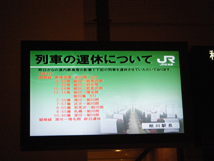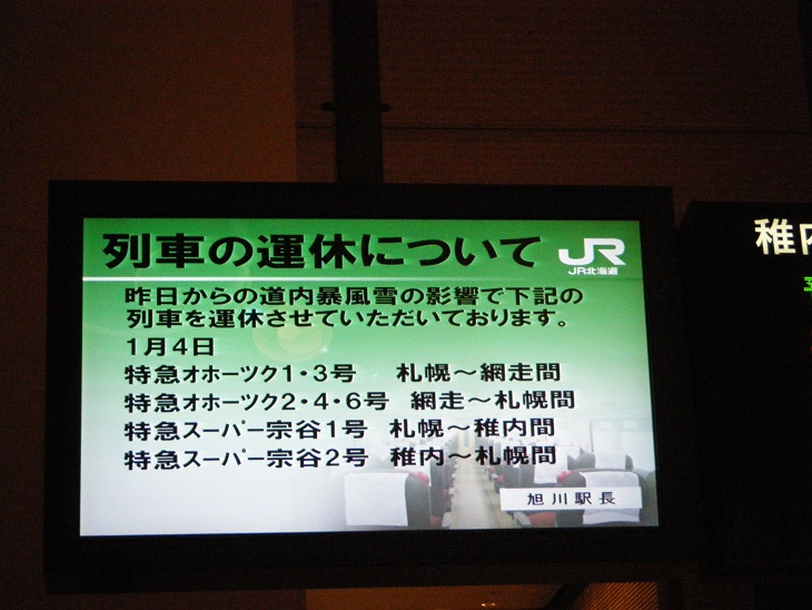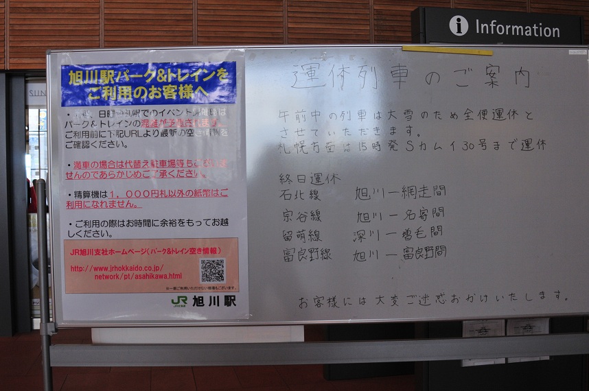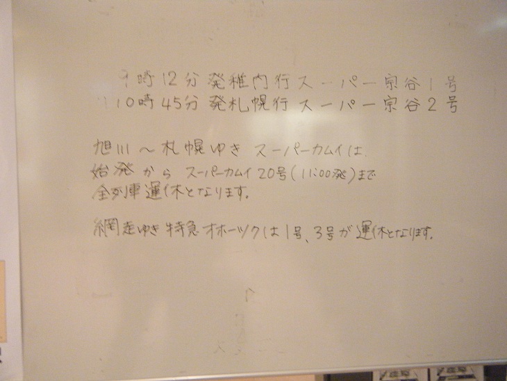 おいおい駅員氏もわからんのかよ・・・。ちなみに昨日は旭川発15時のスーパーカムイが走っただけで残りはすべて運休。さらに札幌から何本かスーパーカムイが出発したものの旭川までやってくることができずすべて途中で引き返すというとんでもないことになってしまっていたらしい。