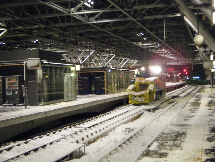 ホームに上がるとこのありさま。屋根のある構内にもこれだけの雪が吹き込んでいる。ラッセル車まで出動する自体である。