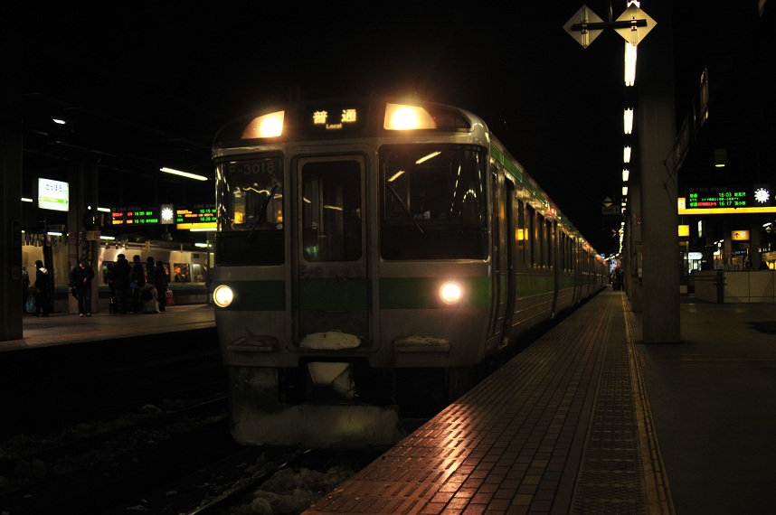 16時44分、終点岩見沢到着。やはりここも雪多し。ここで711系の旭川行きに乗り換え。(←先日Nゲージ買った。やっぱいいよね。)