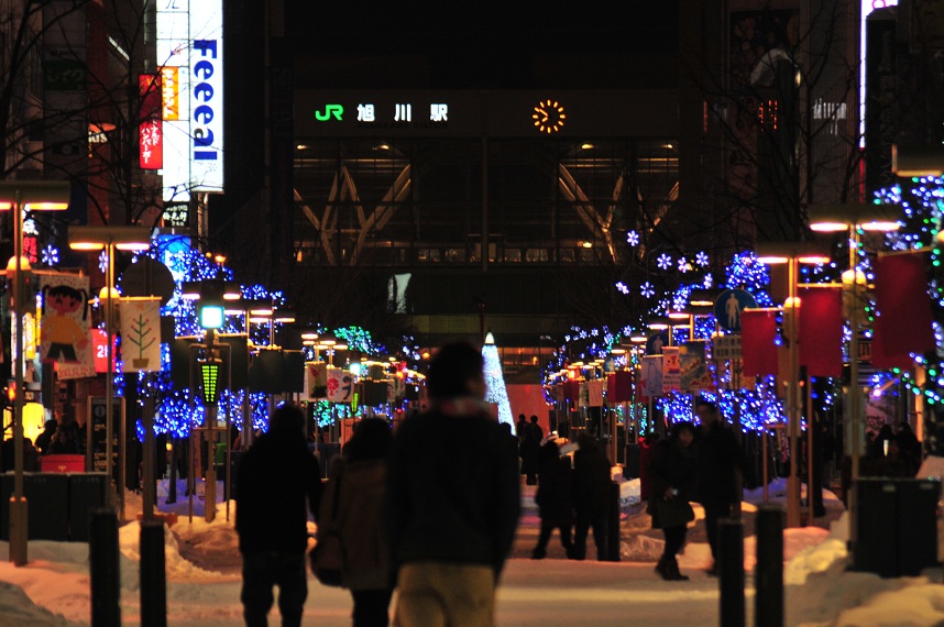 そして再び買物公園の筋に戻り行き着くところまで歩いてみる。するとある一定のところから徐々に人通りが少なくなり空いてる店も少なくなり最後の辺りは歩いてる人もまばらな閑散とした通りになっていた。正月だからかもともと遅くまでやってる店ではないのか両サイドの店舗もあいているところは全くなくなった。そしてこの買物公園の行きつく先には旭川大学の専門学校がありそこが買物公園の終わりの地であった。
