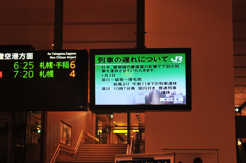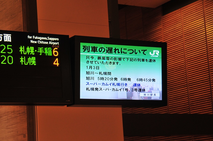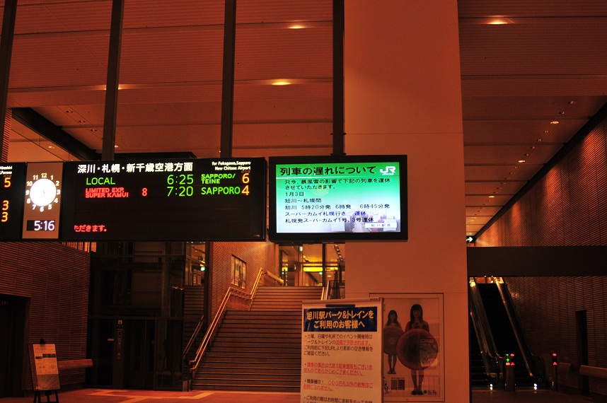 ドアを押して中に入る。「あれ??」なんか様子がおかしい。コンコースに人がたむろってる。嫌な予感がする・・・。そして予感は的中した。大雪の影響で僕が乗る5時20分発のスーパーカムイ2号、その後発車する6時発の4号、6時45分発の6号まで運休が決まっていた。どわ~なんということだ。これでは深川発5時44分の増毛行きに乗れないではないか。