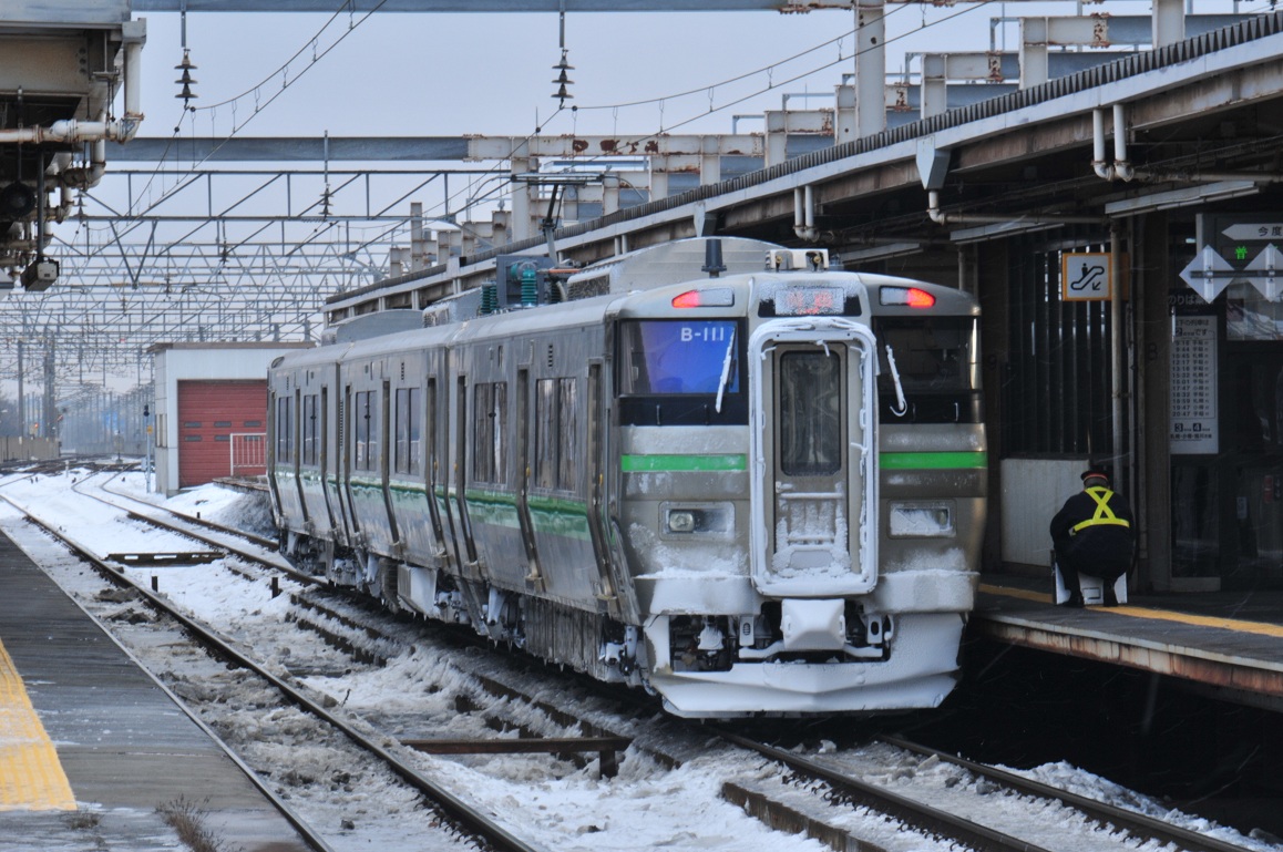 雪の中、室蘭からやってきた11時00分発の登別行に乗車。わずか21分の乗車で終点登別に到着。各駅停車を乗り継いでも千歳発14時27分の夕張行きには間に合うんだが新千歳空港に向かうので苫小牧までの一区間を特急に乗車する。