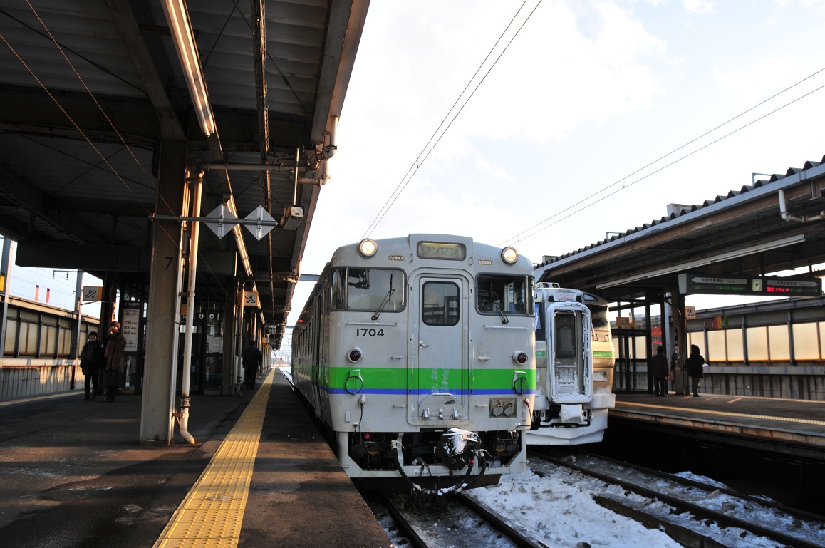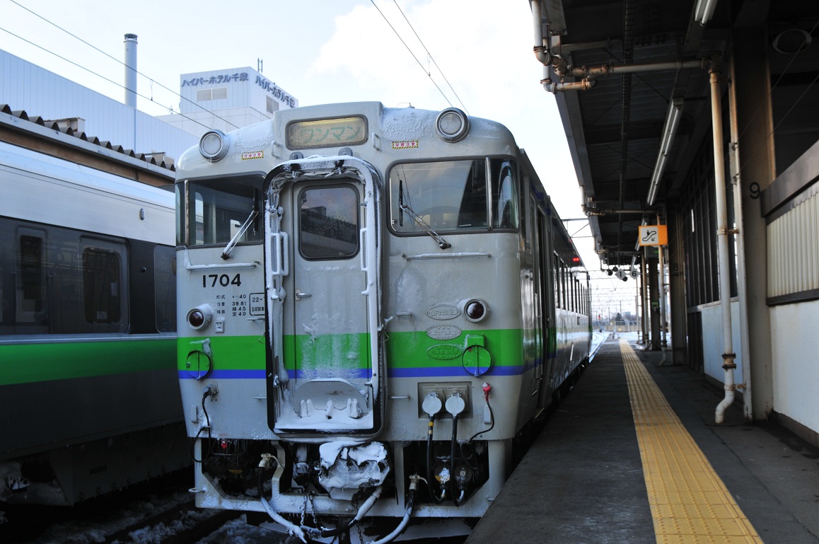 ホームに停まってると思われた夕張行きのキハ40形の姿が見えない。まぁ発車は14時27分なのでそれまでに晩飯でも買っとくかと改札を出ようとしたら嫌な情報が飛び込んできた。なんと強風で夕張からの列車がまだ到着していないという。なんということだ。ここまできて夕張駅に行けなくなってしまうのか??とはいえ遅れているものはしょうがない。とりあえずビールとつまみを購入して駅員氏に再度確認する。すると列車は30分くらい遅れるとの情報が・・・。おいおいこりゃほんとにマズイんじゃないの??