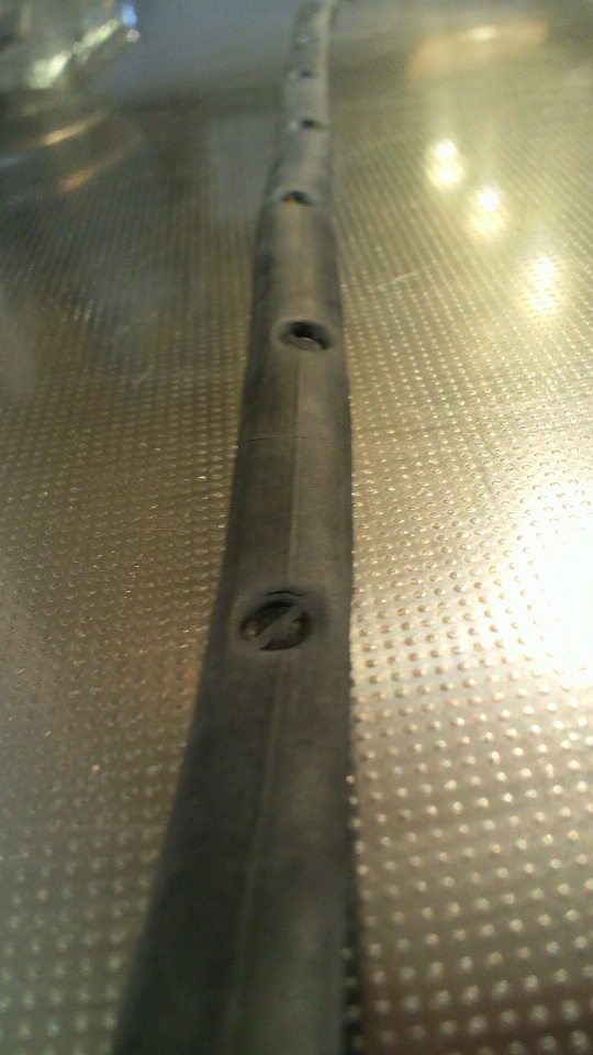 古いリムテープ。硬化してボロボロ。スポークのことろがエンボス印でも押したかのようにボコッとしてる。