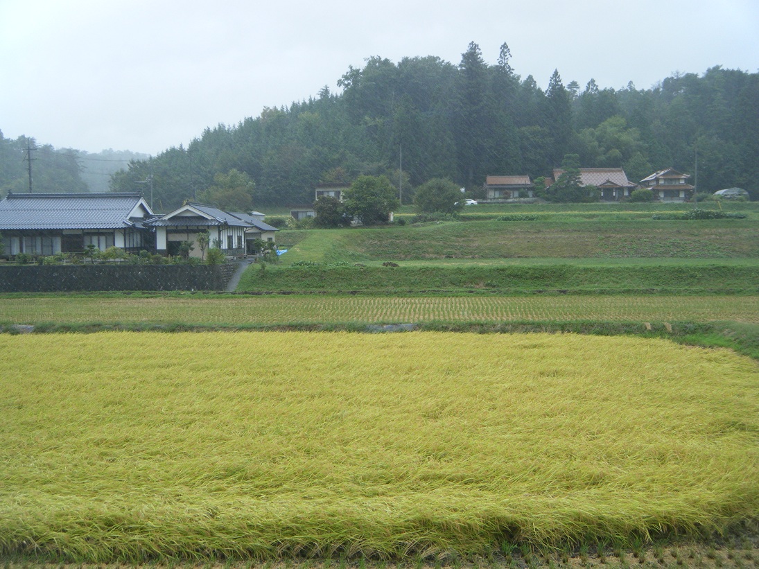 作業の途中、2階のベランダから撮影。四方八方田んぼビュー。たわわに実った稲穂が垂れる清く正しいニッポンの農村である。