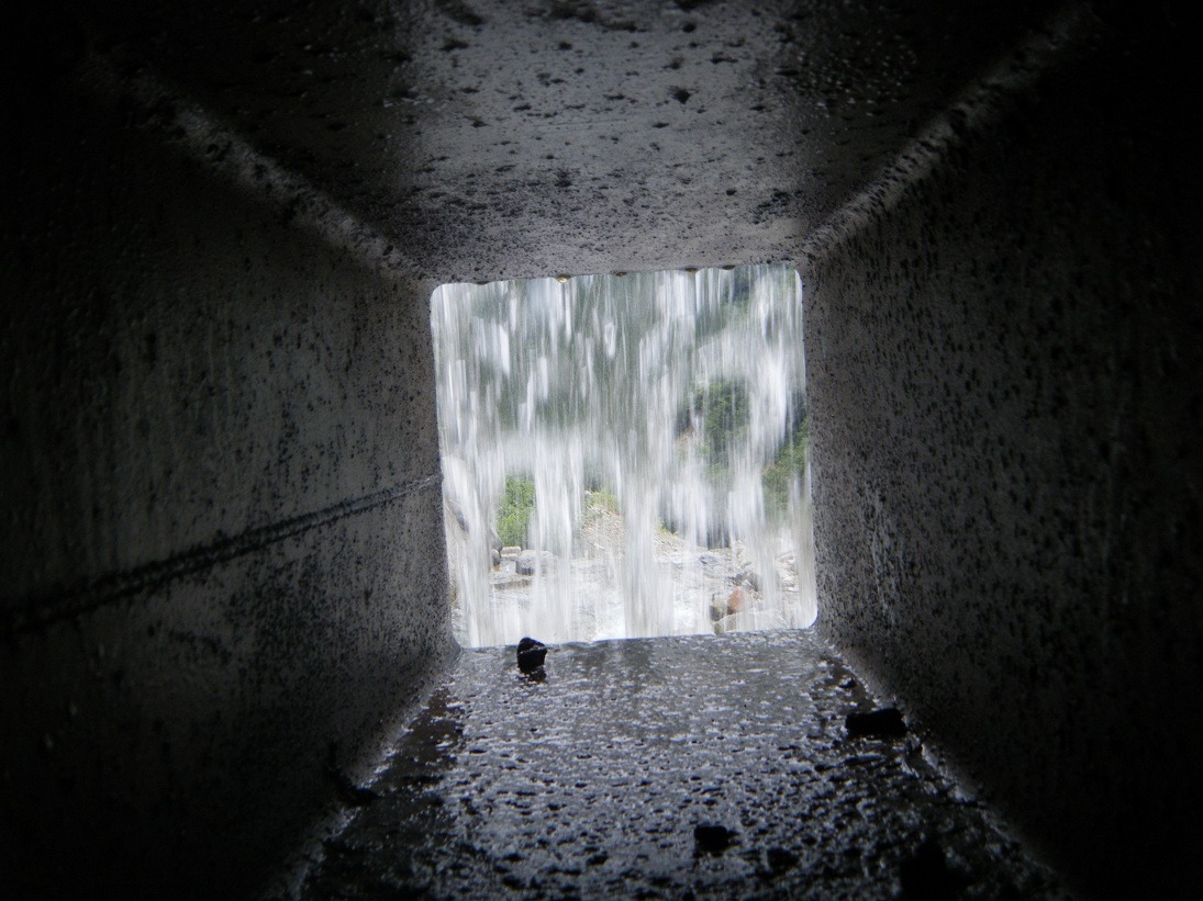 トンネルの中から流れ落ちる水の裏側を見ることができる。