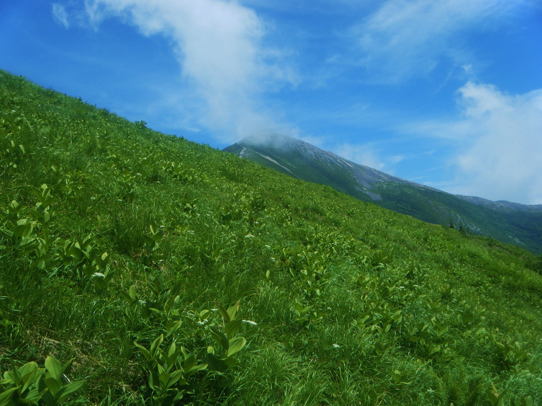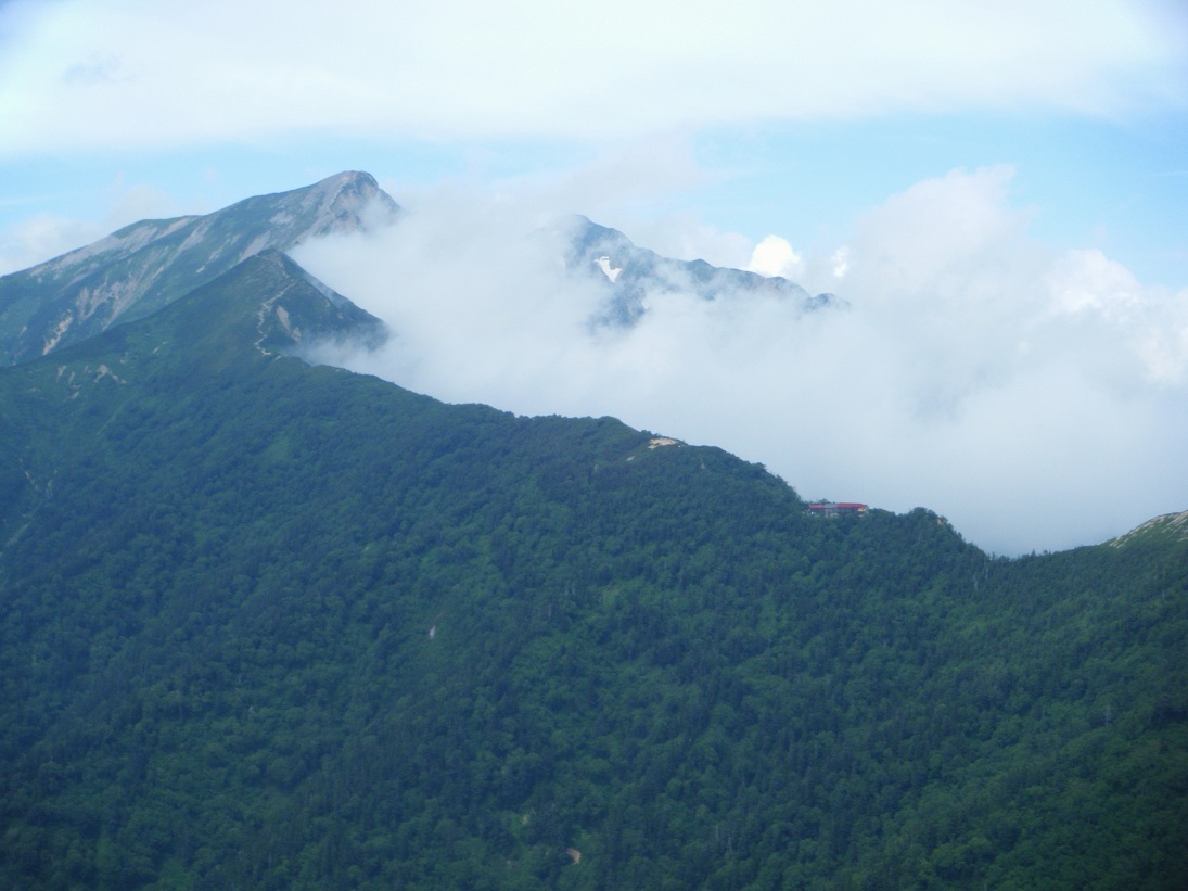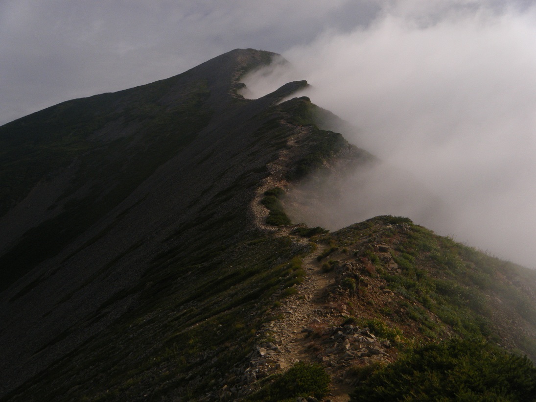 中峰に登ると中峰と巻き道との合流点でK籐と再び合流。その後、山荘をめざしハイマツ帯の下り道を歩く。ところがしばらくすると右目のコンタクトが曇ってきた。「ん?なんじゃ??」 なんかタンパク質でも付いたのかとにかく右目が曇る。目薬さしてもダメ。不快感極まりないので冷乗越で眼鏡に切り替えるべくコンタクトを外す。すると