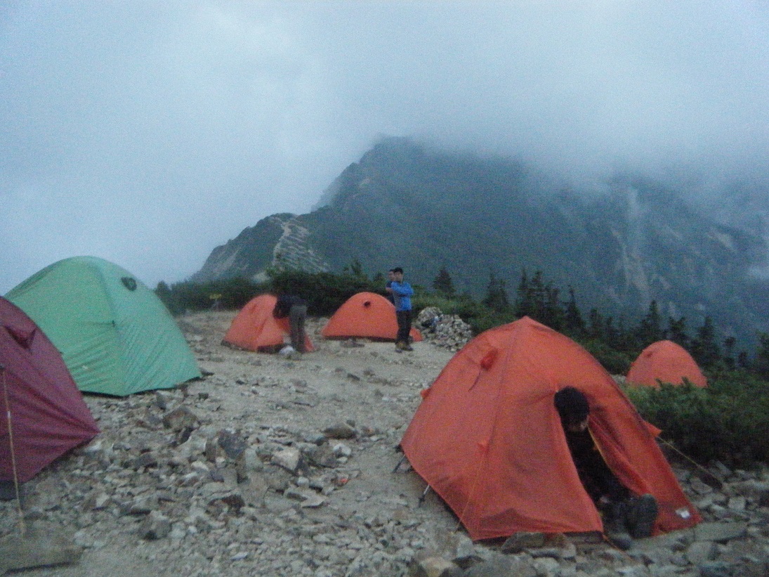 8月11日。4時45分起床。毎度のことながら熟睡ではなく途中何度となく目が覚めてうつらうつらやってるうちに朝が来たと言う感じ。この時間に起床と言っても周りと比べると遅い方だ。テントを抜け出すと半分以上のテントは無くなっておりすでに出発していた。僕の前のテントの人も撤収中でありちょっと話をしたところ今日は扇沢まで下りるらしい。