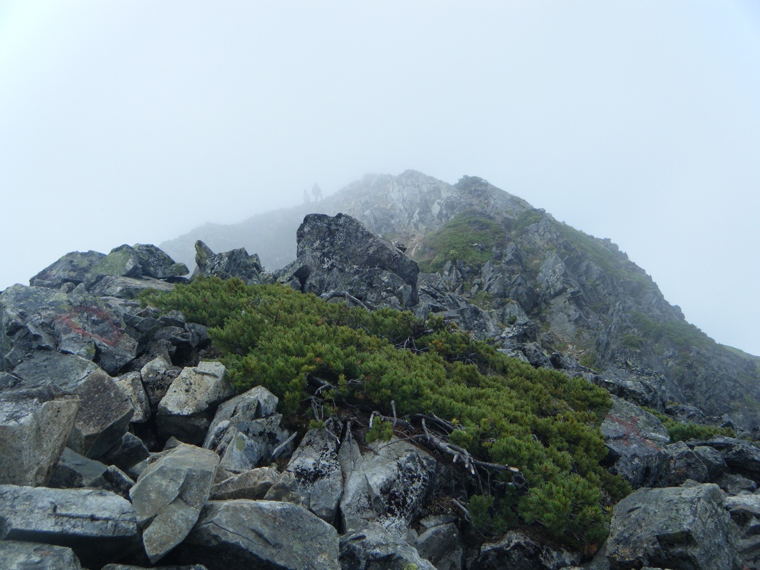 ガスにかすむ鹿島槍南峰へはもうひと登り。