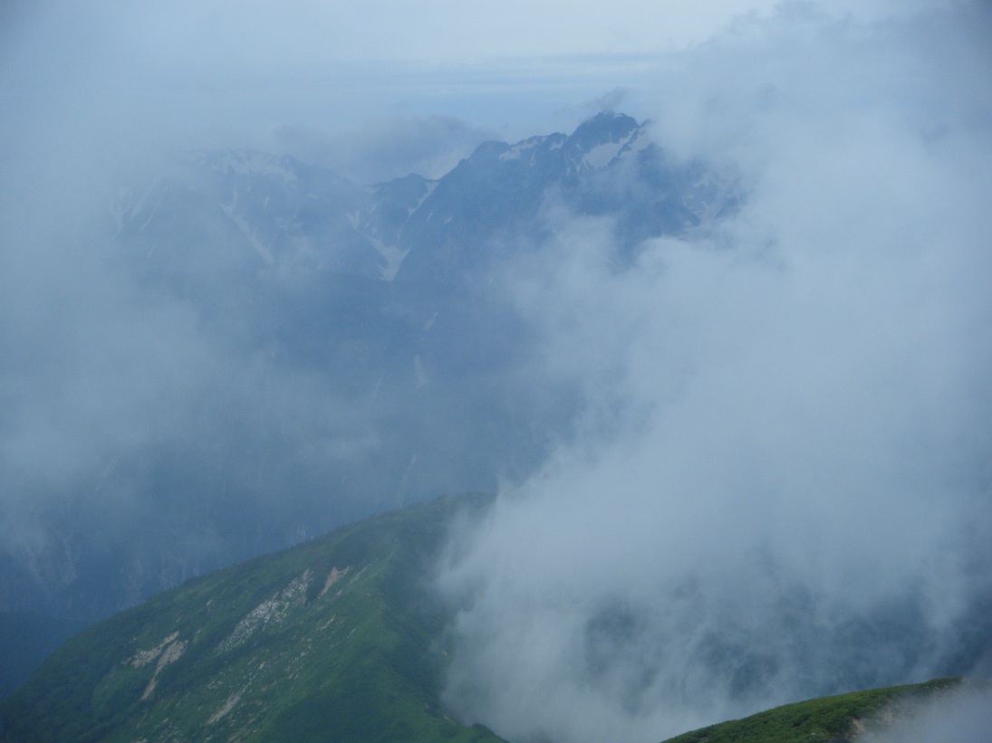 ガスの切れ間に一瞬剱岳が姿を現した。