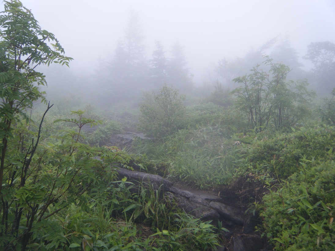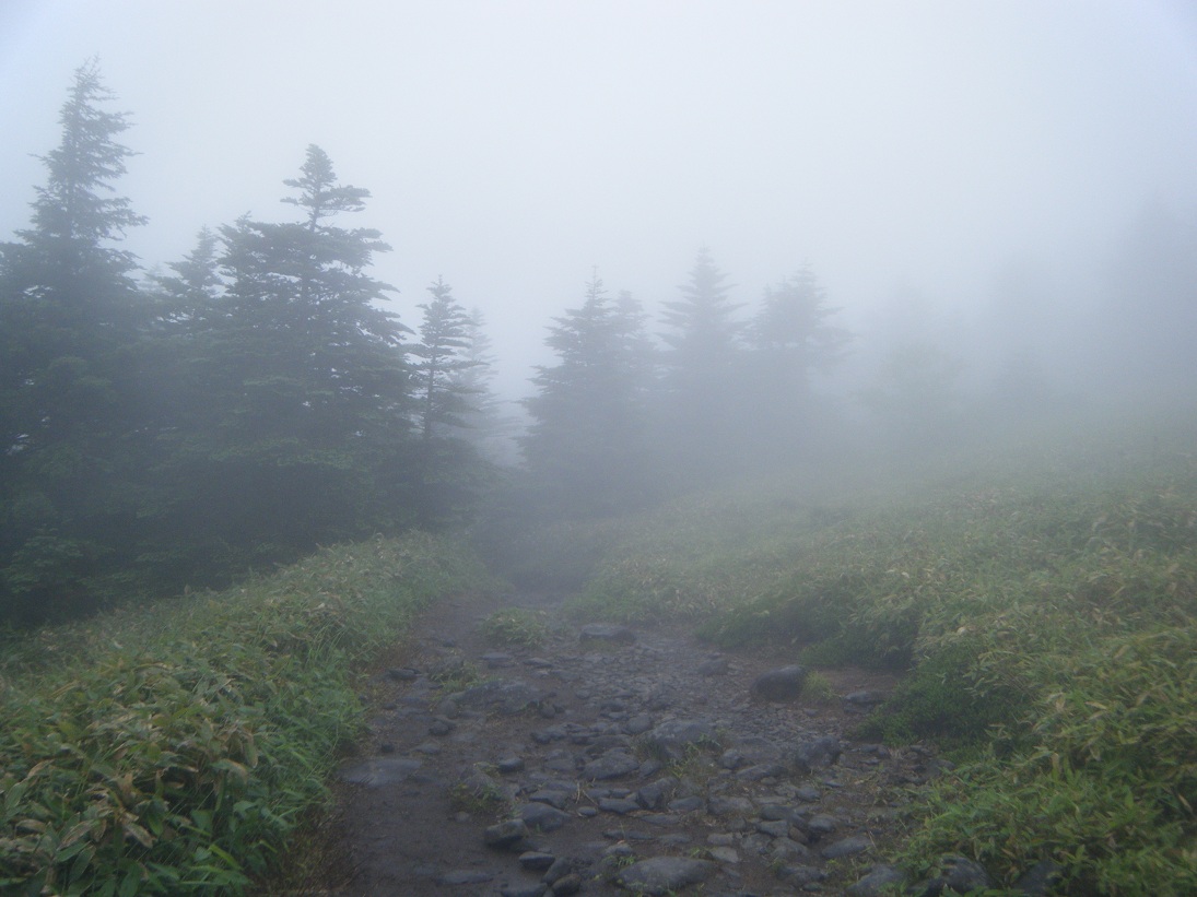 歩き始めて50分、先行者に追いついた。ご夫婦と思しき二人パーティーだ。自分と同じルート上に人がいたとわかってちょっと安心した。クマちゃんに対する不安もだいぶ軽くなった。それから5分と歩かないうちに再びご夫婦と思しき2人パーティーを発見。道標のところで休憩をしていた。さすがに百名山。いるんだねぇ~。こんな天気の悪い日でも。