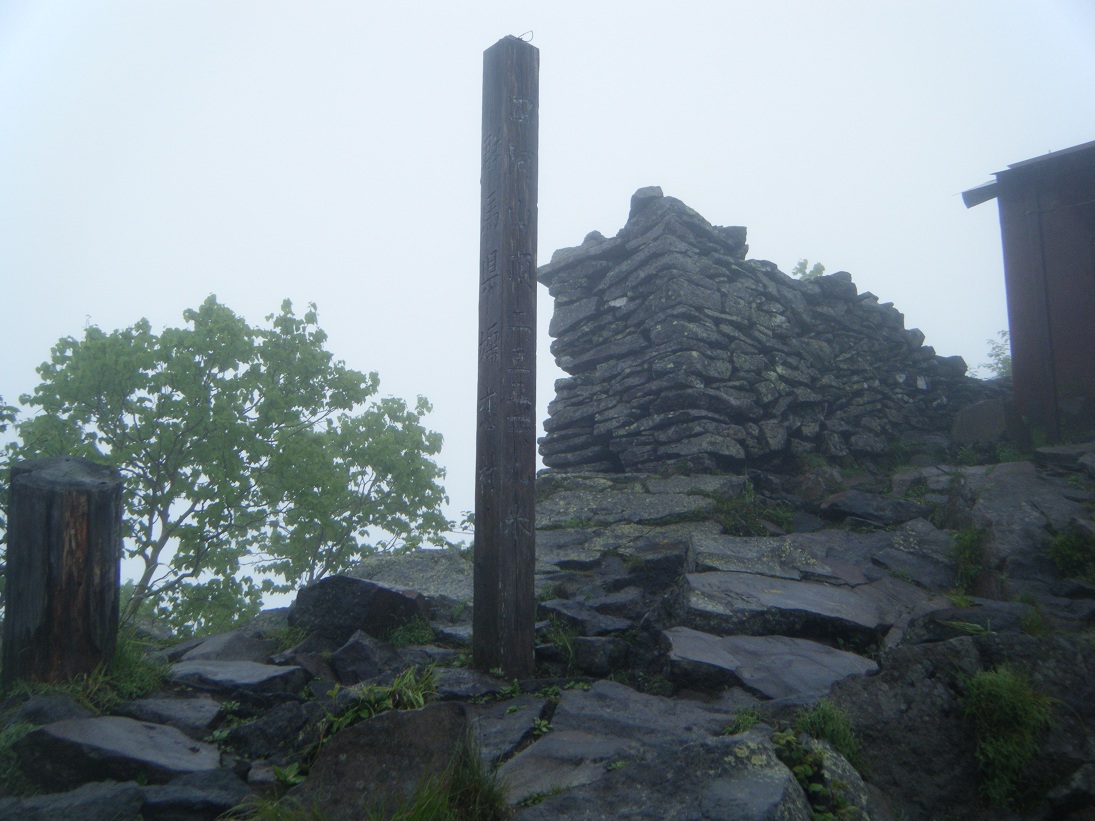 山頂には先客がいた。僕と同じような年の男とそのお母さん。地元須坂の人だそうだ。僕が兵庫から来たというとたいそうびっくりされてた。東日本の地味な百名山で「兵庫から来ました」というとたいてい「へぇ~」と驚かれる。まぁそうだろうな。東北の人がわざわざ六甲山に登りに来たと言えば僕も「へぇ~」と思うだろう。ところでこのお母さん、今回が初めての山だそうだ。いや~初山行がこのガスの中というのは残念!!しかしいい息子だな。親を山に連れて来るとは孝行息子だよ。