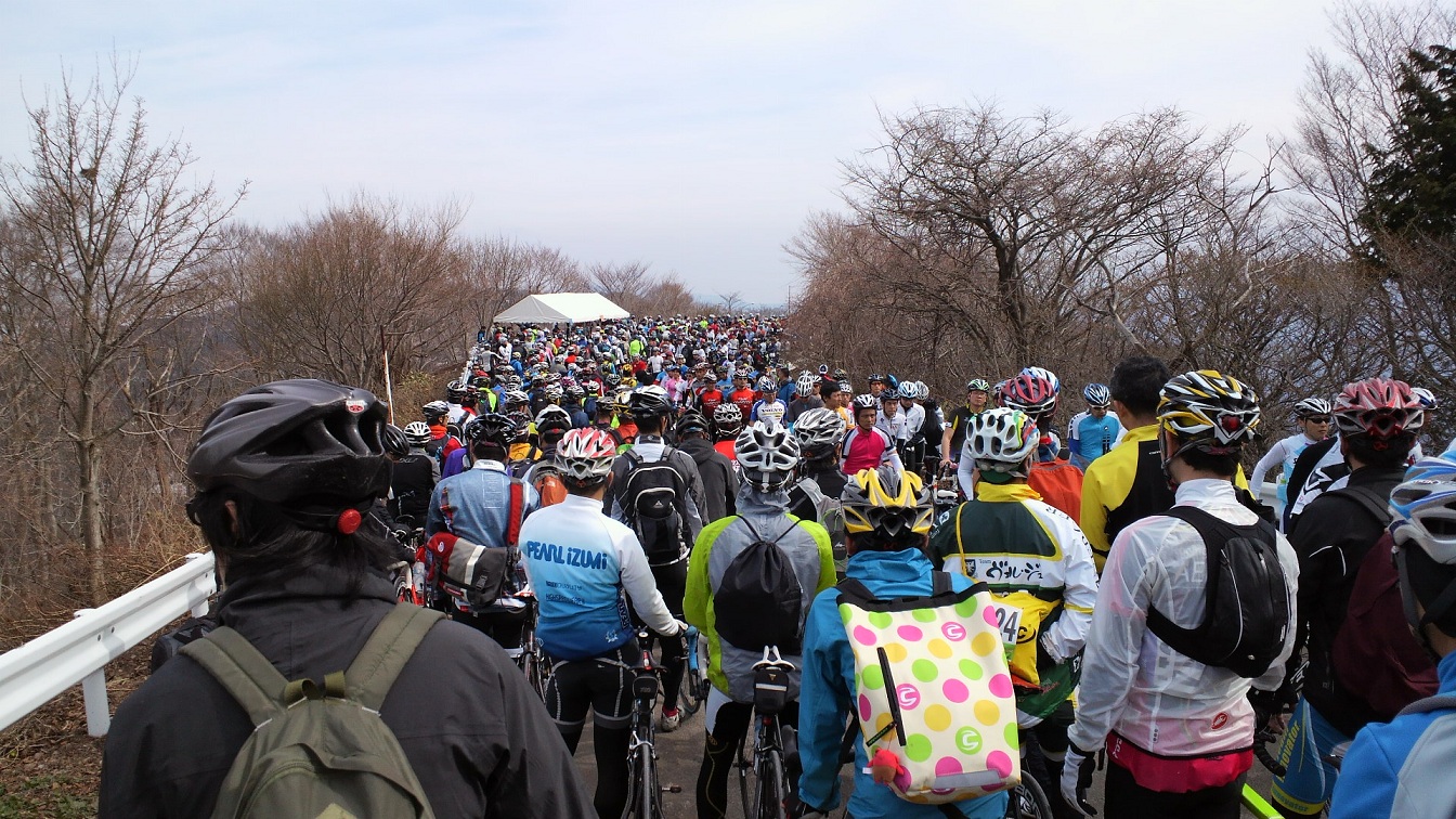 いざ下山開始。寒くないからいいやと思って上着を着ずにそのまま下り始めると一気に体が冷える。おぉぉ~寒いぞぉぉぉ~。これはたまらんと下山の列からはみだして上着を着る。パールイズミのウィンドブレーカーを忘れて代わりにモンベルのストームクルーザーを持ってきてしまった。自転車乗ってるのに山のジャケット着るのはかっちょ悪いという思いもあってそのまま下山を始めたんだけどそんなこと言ってられない。ロードに乗ってるのにフードのついたジャケットを身にまとい再び下山の列へと加わる。いやーさすがストームクルーザー。氷点下の冬山でも活躍できる逸品だけにこれしきの風にはビクともしない。いやー暖かいわ。いつもの箕面や六甲みたいに前方から車が来ることはないので快適なダウンヒルである。しかも六甲よりカーブの角度が緩いので走りやすい。ヒーヒー言いながら登ってたのを思い出しながら清々しい気持ちで麓まで下った。