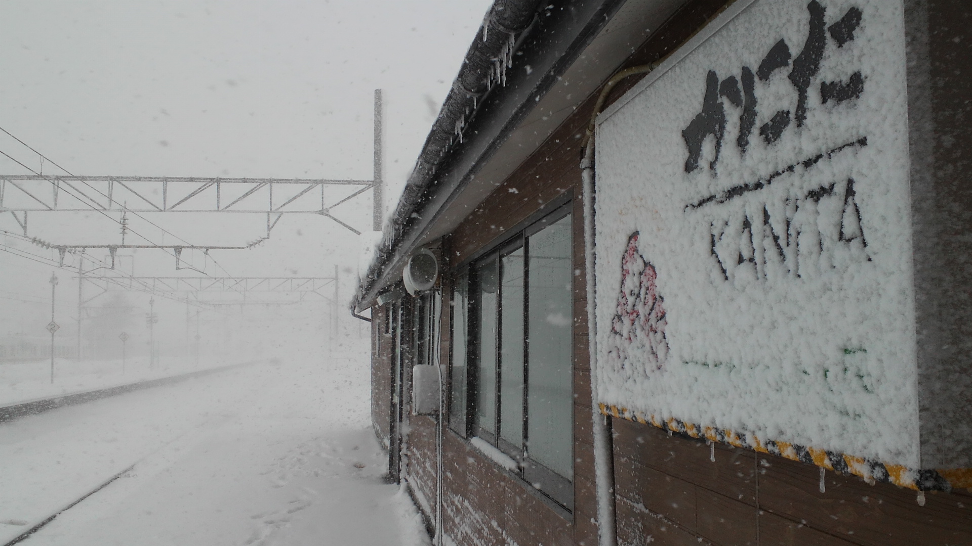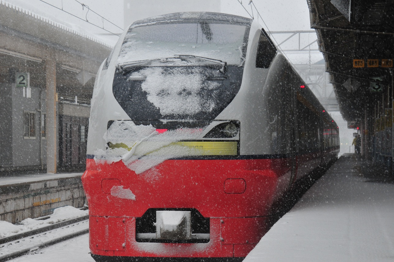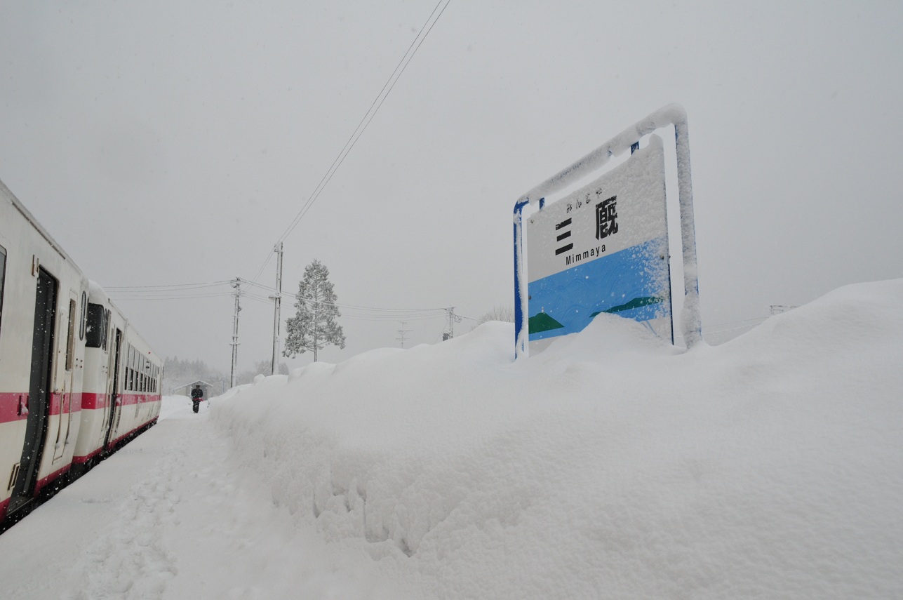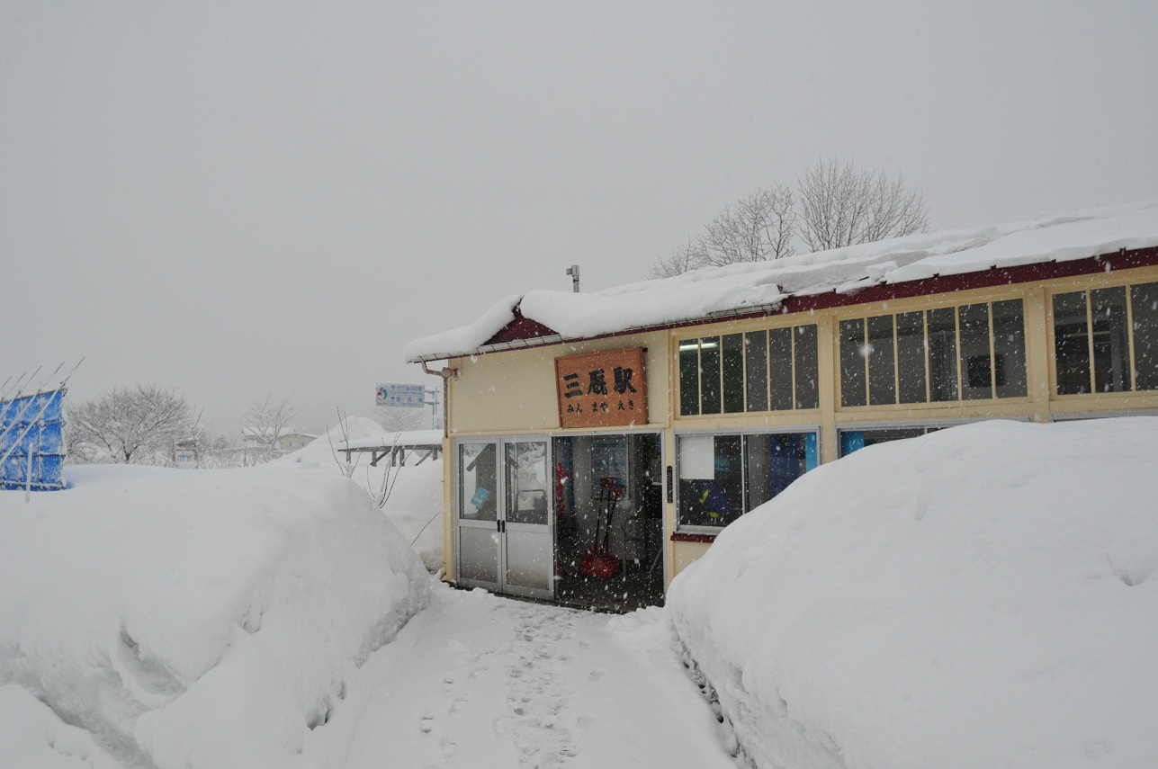 雪はますますひどくなる。ただでさえ雪で真っ白なのに巻き上がる雪で窓の外が全然見えない。中沢で4分停車。ちょっとホームに出てみるも横殴りの風雪にあっという間に体温を奪われる。いや~その辺の雪山といい勝負だ。