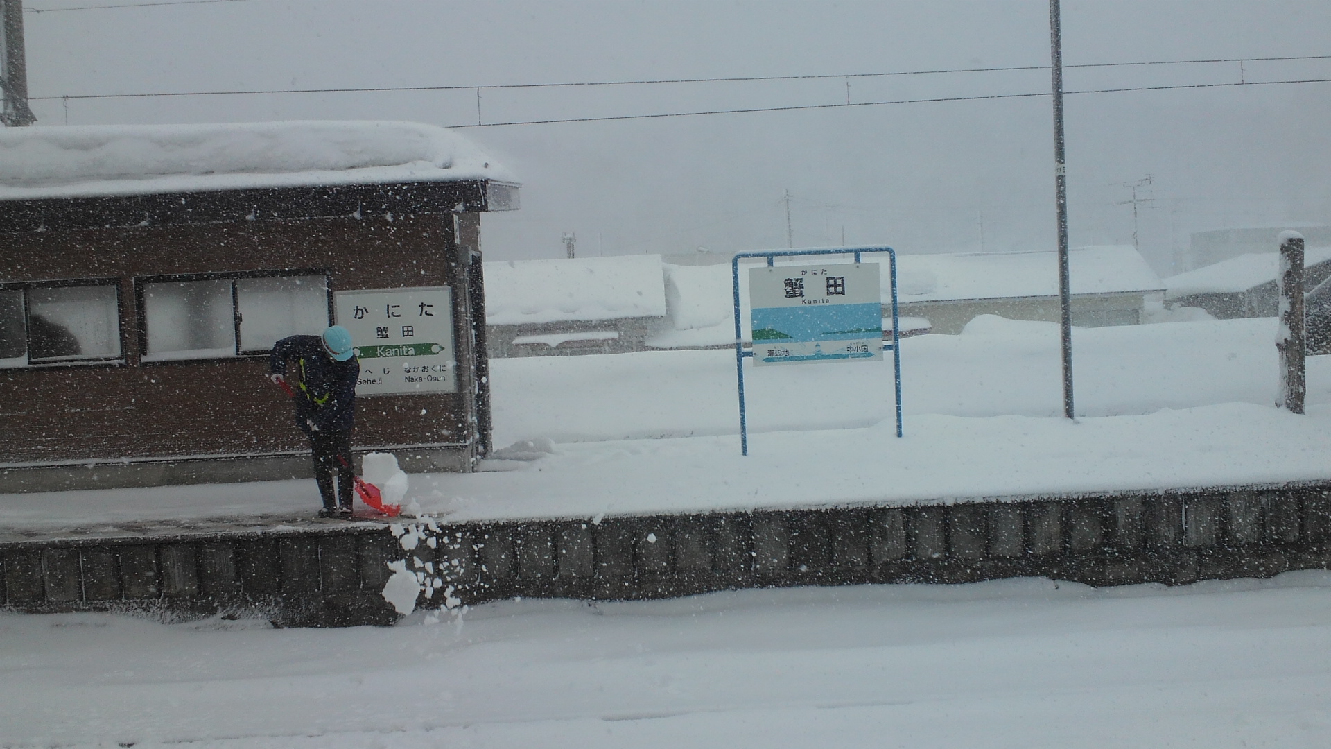 僕の乗る14:01発の青森行きも折り返しの列車の到着が遅れて17分遅れで出発した。瀬辺地では行きには見えてた駅名表に雪がついていて全く見えない。朝よりもさらにひどいことになっている。郷沢でも保線の人がホームで雪かき。こんだけ降ってりゃやってもやっても追いつかないだろう。大変だ。ご苦労様。